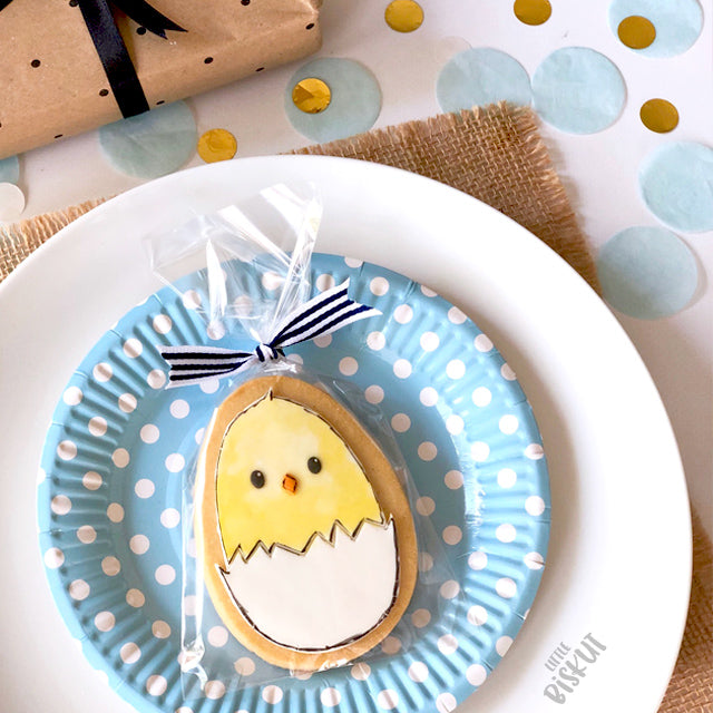 We are so eggcited to offer a limited number of these cute little chicks! Featuring hand painted detailspresented in a clear cello bag and tied with navy and white stripe ribbon.