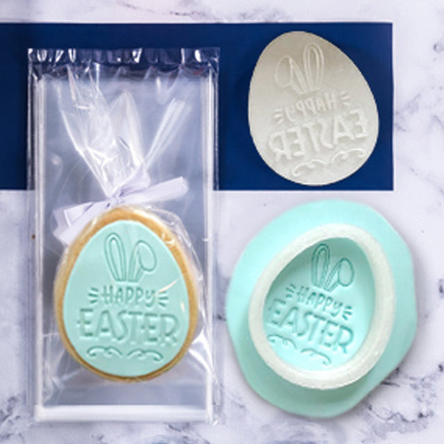 Creating super cute cookies with our Happy Easter stamp. Photo shows example of the stamp on a 70 x 55mm egg shape.