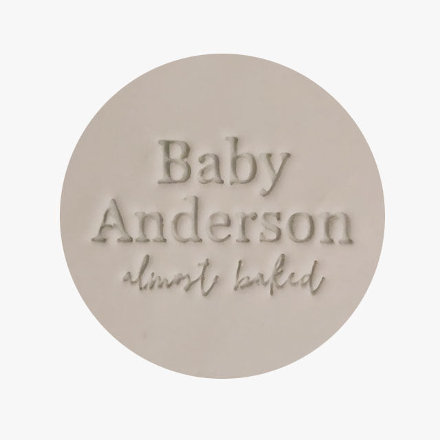 Make your next baby shower extra special by creating beautiful, customised cookies favours with this 'Almost Baked' stamp. Photo shows example of the stamp on a 65mm circle.